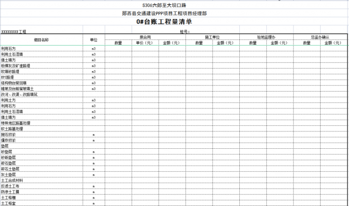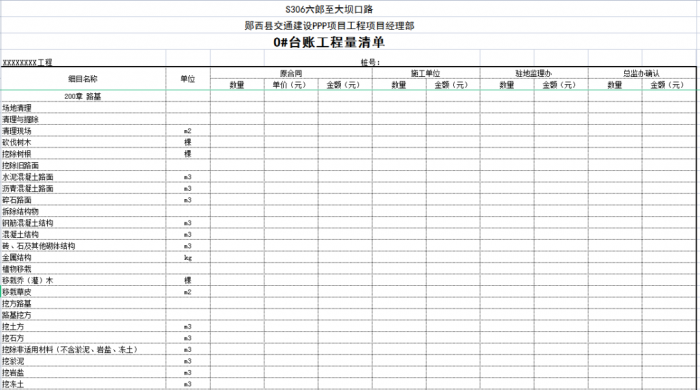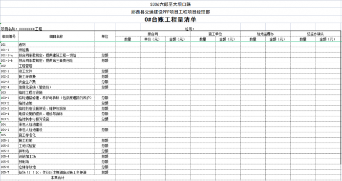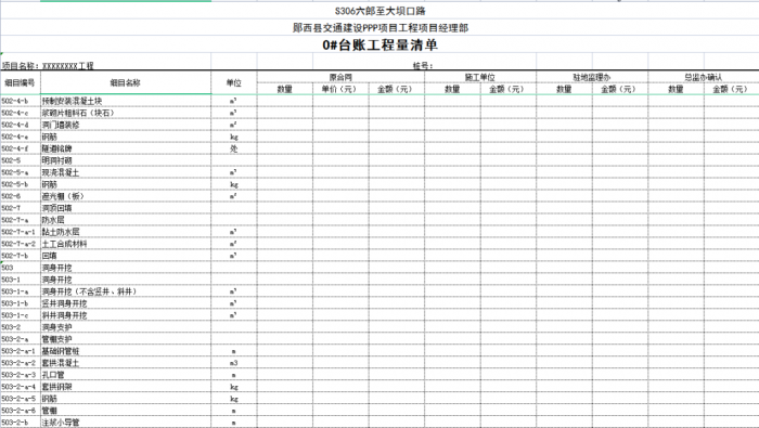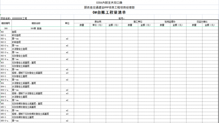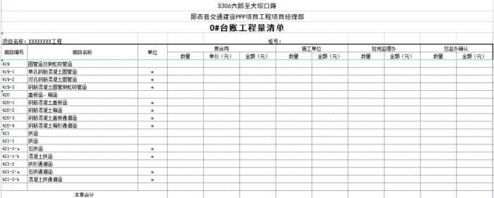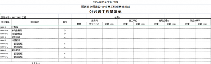 一個項目或一個合同段的臺賬由n條可以獨立計量的工程結構(單元)組成,一般情況下一條臺賬應包含子目號、子目名稱、單位、工程數(shù)量、單價、合價、里程樁號、工程部位描述、圖紙編號、備注說明等。
